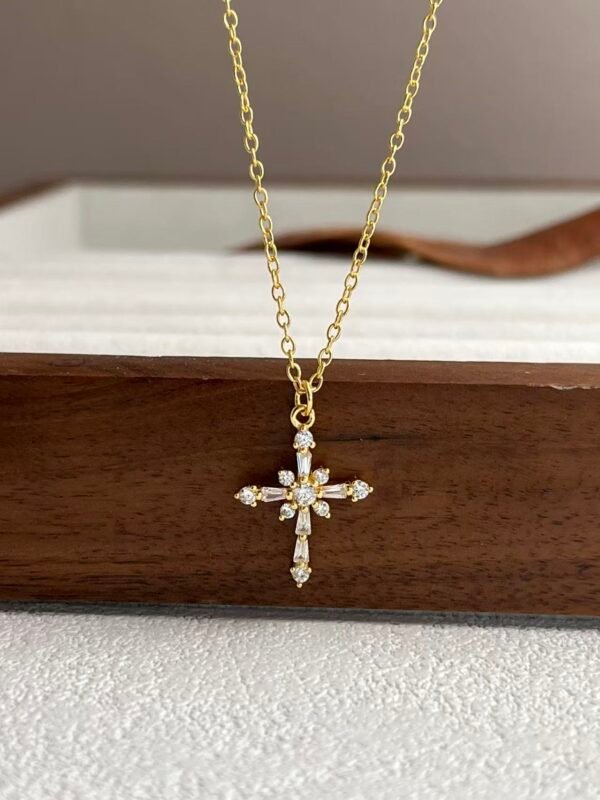 Collar de Cruz con Circonitas en Diseño de Flor Brillante, Joyería de Plata con Baño de Oro de 18K