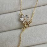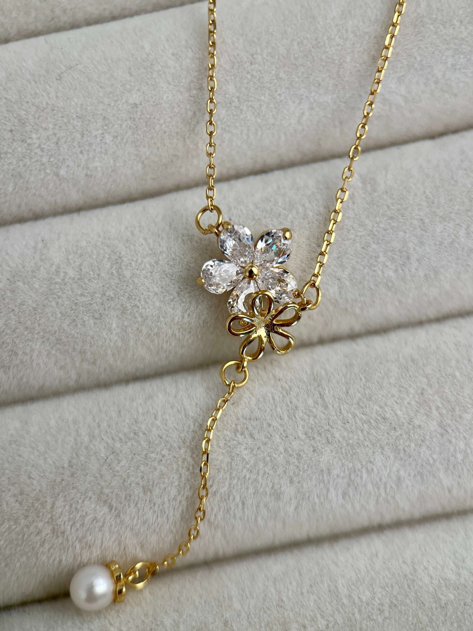 Dieses Schmuckstück ist der zeitlosen Eleganz der Natur im Frühling entsprungen. Das Design vereint zwei zarte Blüten: eine strahlend mit funkelnden Zirkonia, die andere mit einer minimalistischen Goldumrandung – Symbole für die Dualität der modernen Frau: strahlend und natürlich zugleich.