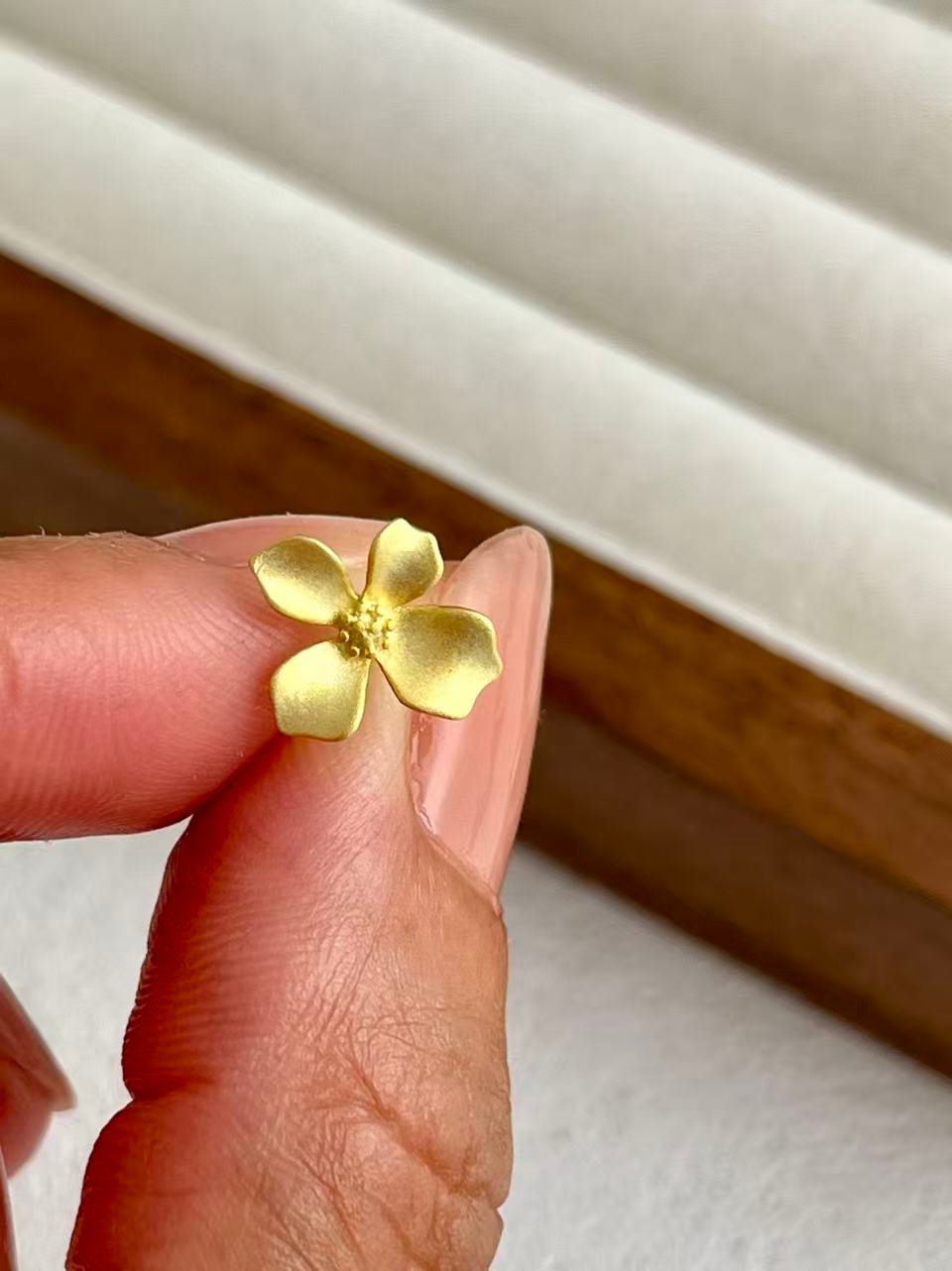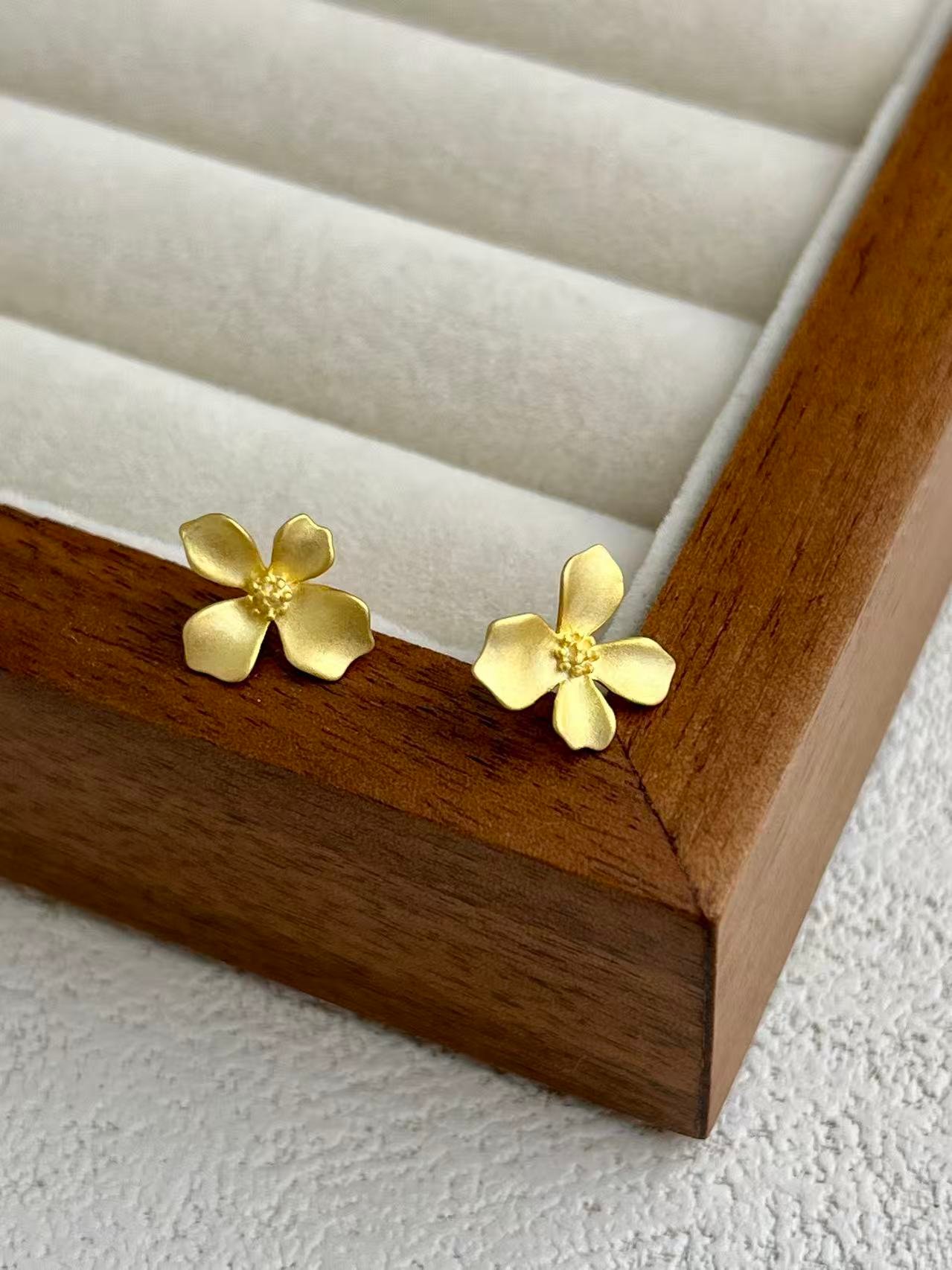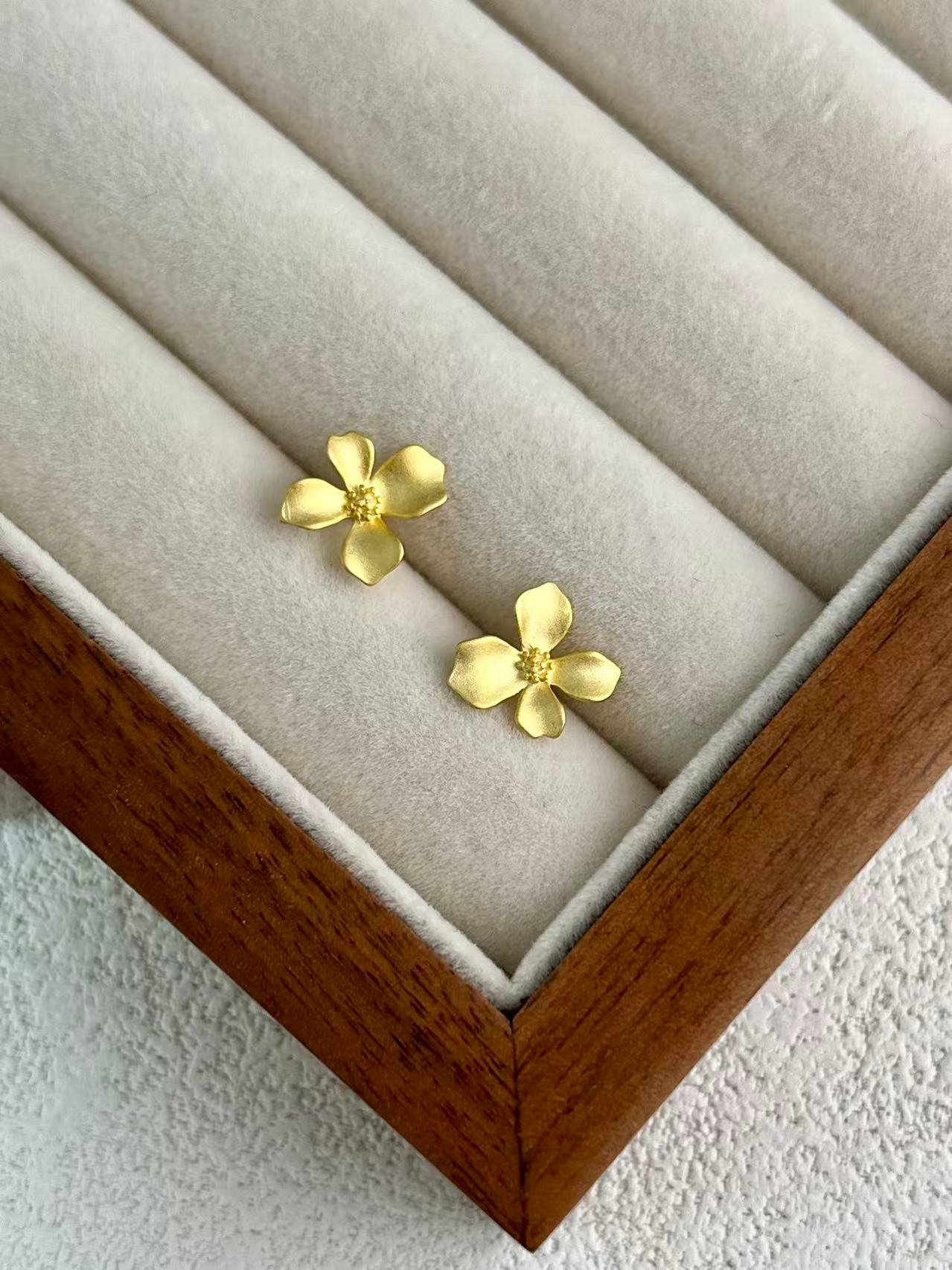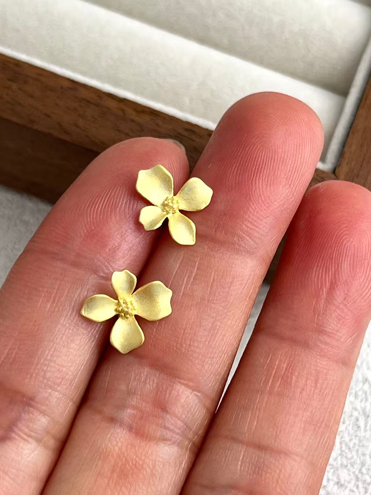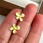Die Inspiration stammt von morgendlichen Spaziergängen durch den Garten, wo der Duft weißer Blüten die Luft mit Ruhe erfüllt. Das Blütenzentrum ist mit einer feinen Granulation versehen, die dem Schmuckstück Struktur und Realismus verleiht. Diese Ohrringe sind so gestaltet, dass sie das Gesicht sanft zum Strahlen bringen und Ihrem Alltagsstil einen Hauch zeitloser Weiblichkeit und handgefertigter Eleganz verleihen.