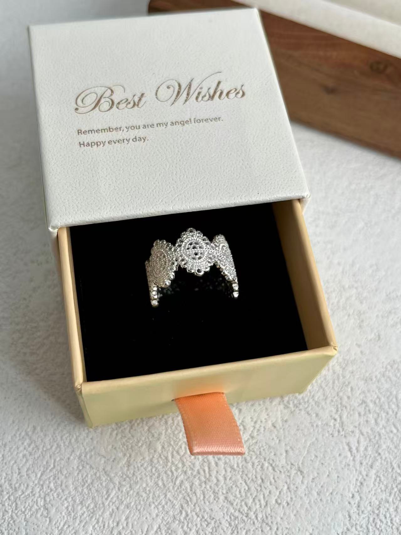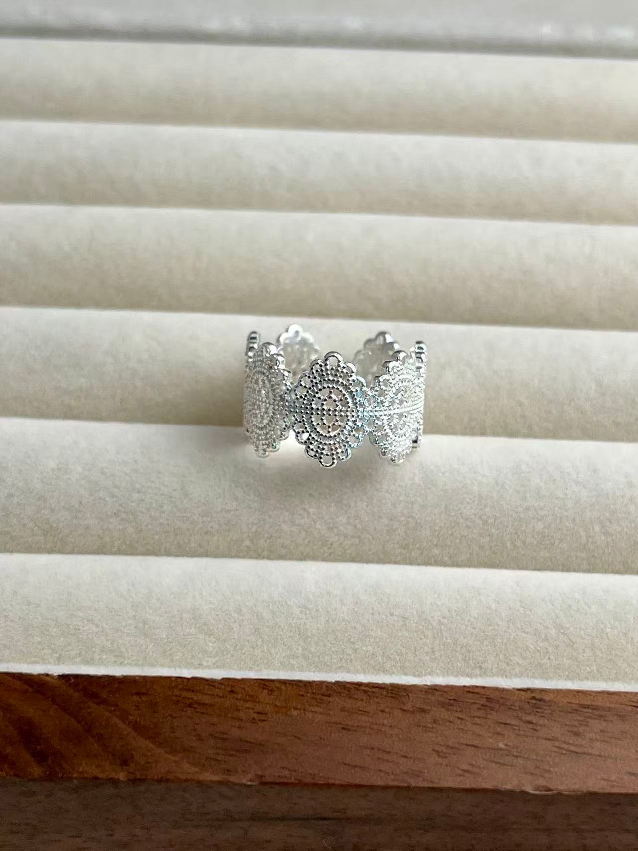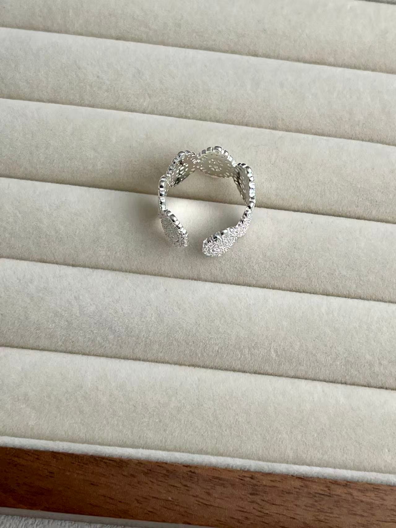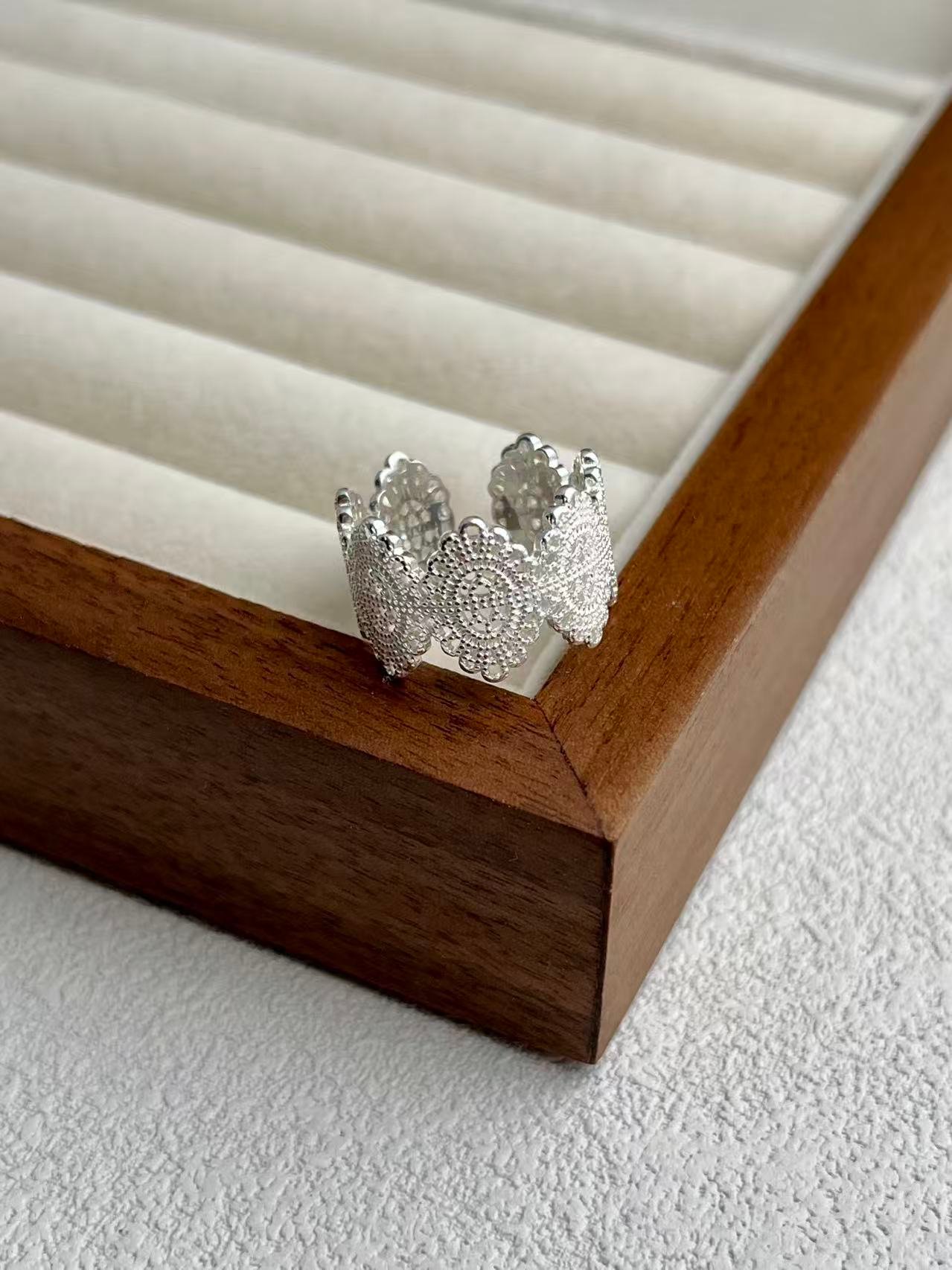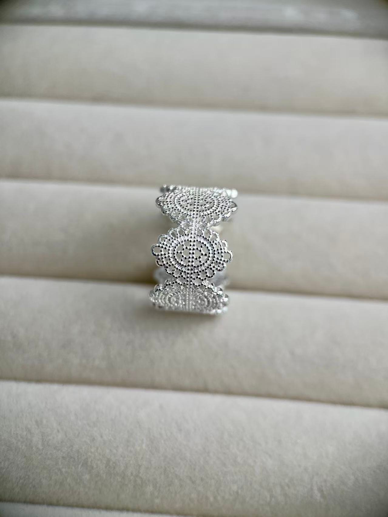Inspirado en el delicado encaje de la época victoriana, este anillo transforma la dureza de la plata en una textura visualmente suave y romántica, capturando la esencia de la feminidad clásica a través de un intrincado patrón calado que evoca los detalles de la alta costura antigua.