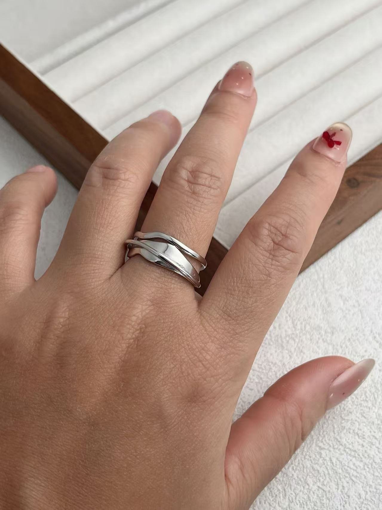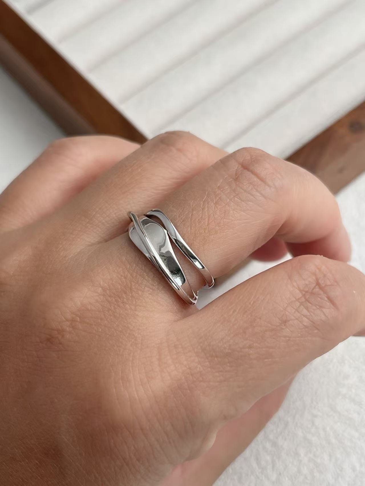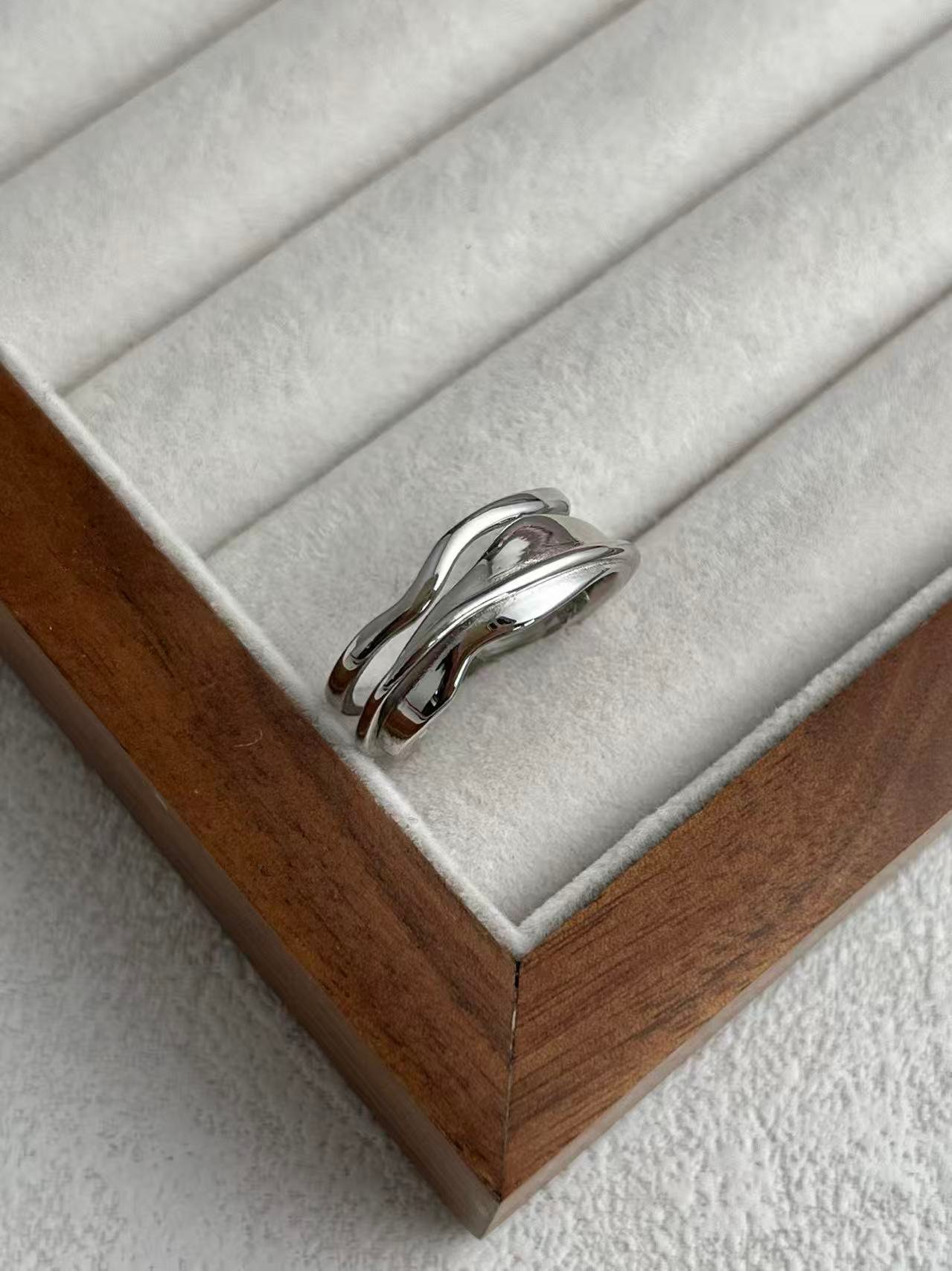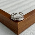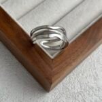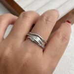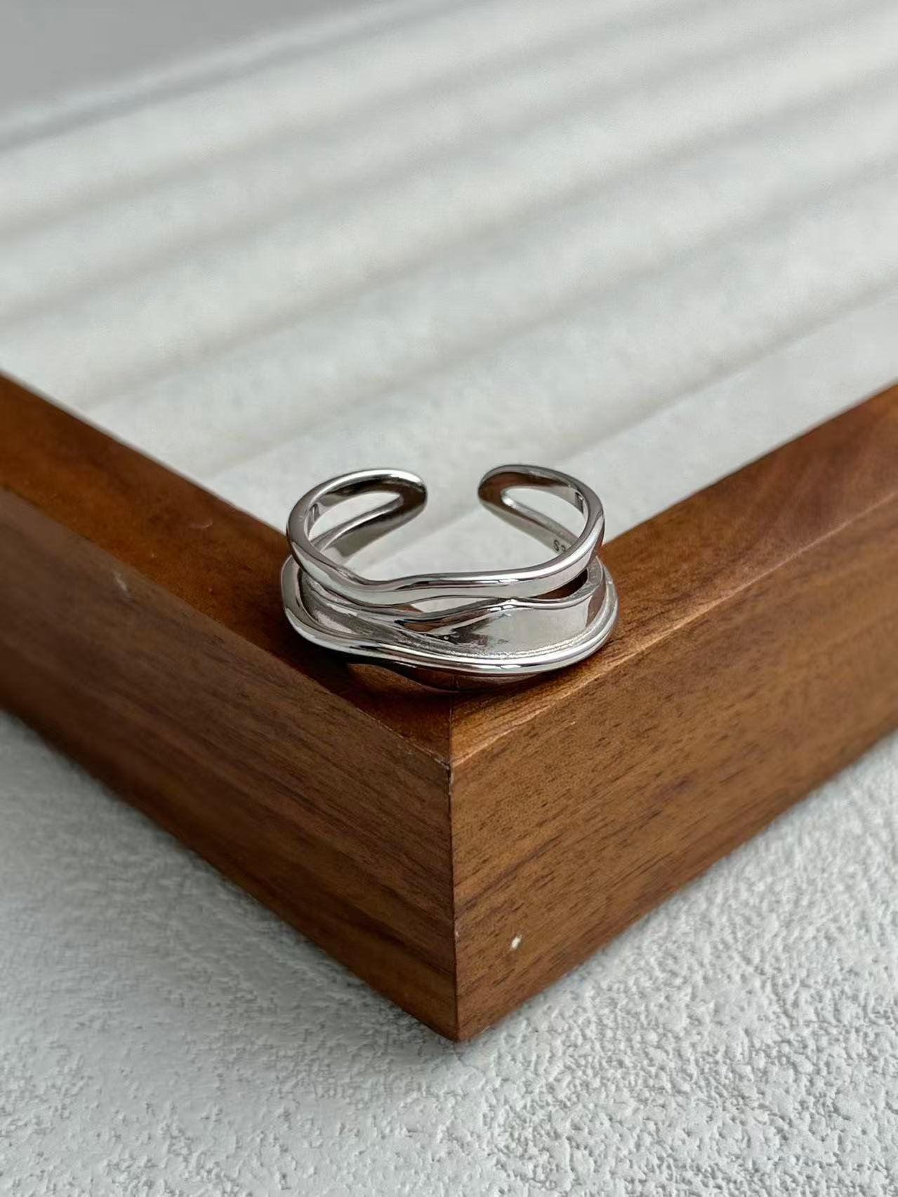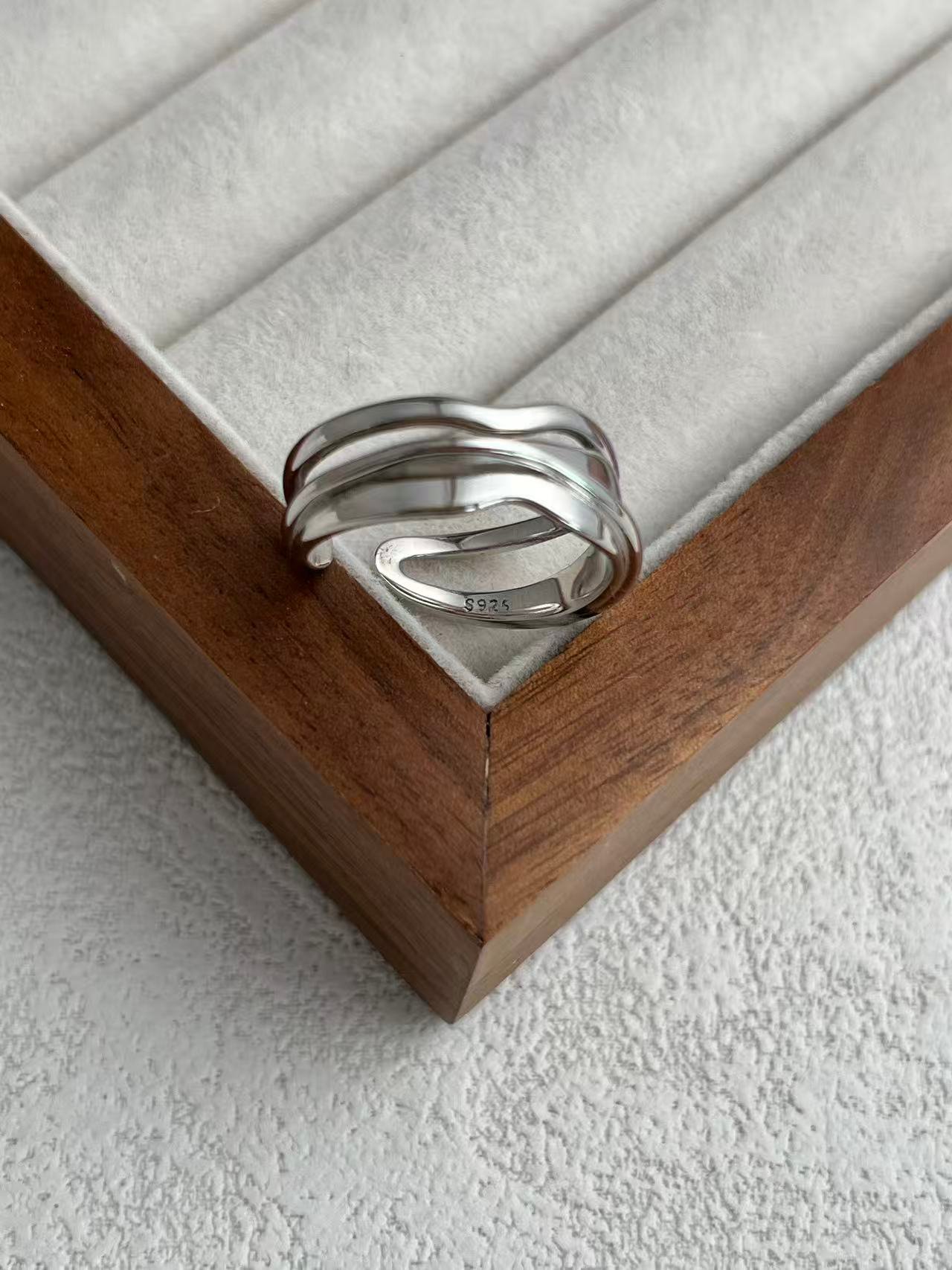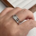 Inspirado en el «Fluir del Agua», este anillo presenta una silueta de capas irregulares y curvas orgánicas que evocan el movimiento de las olas, creando una pieza de estilo contemporáneo y artístico que se adapta cómodamente a cualquier dedo gracias a su diseño abierto.