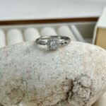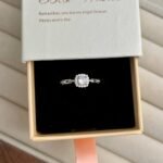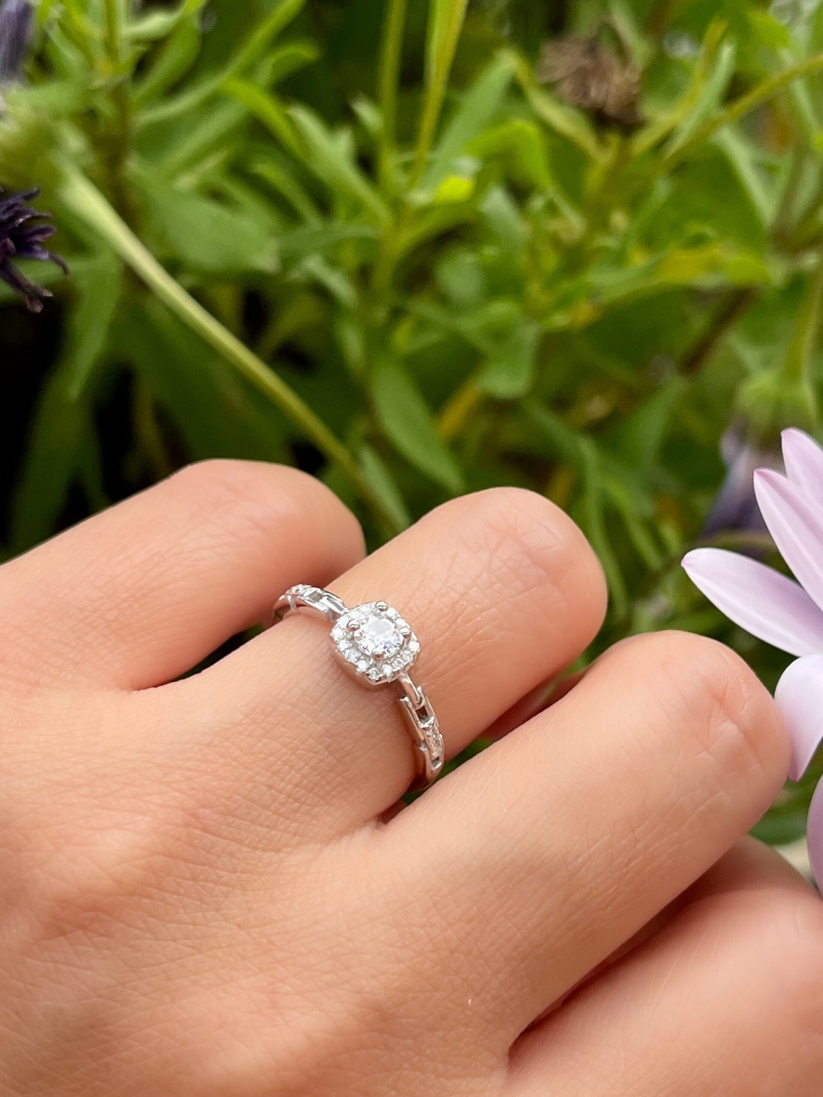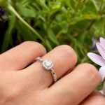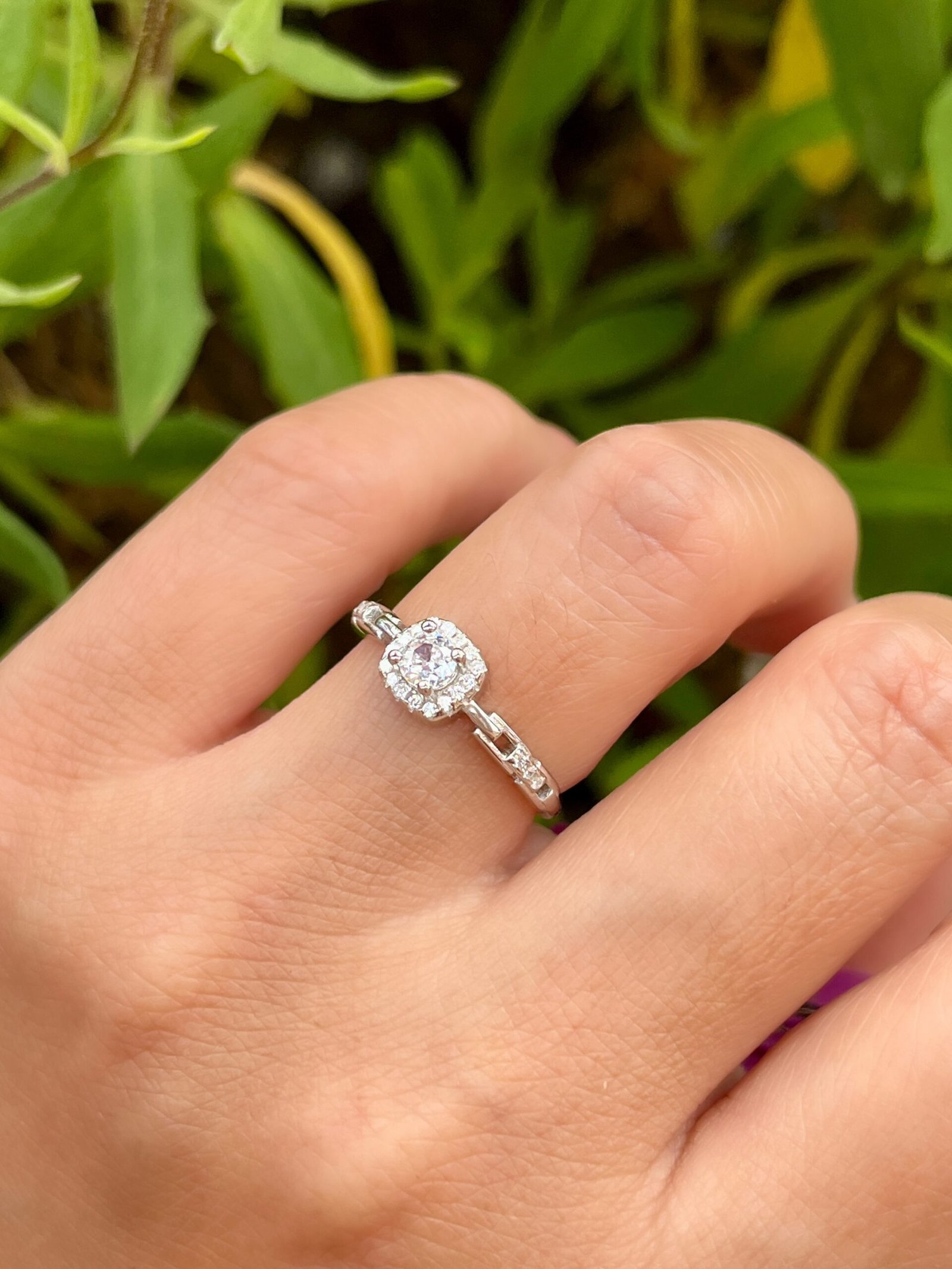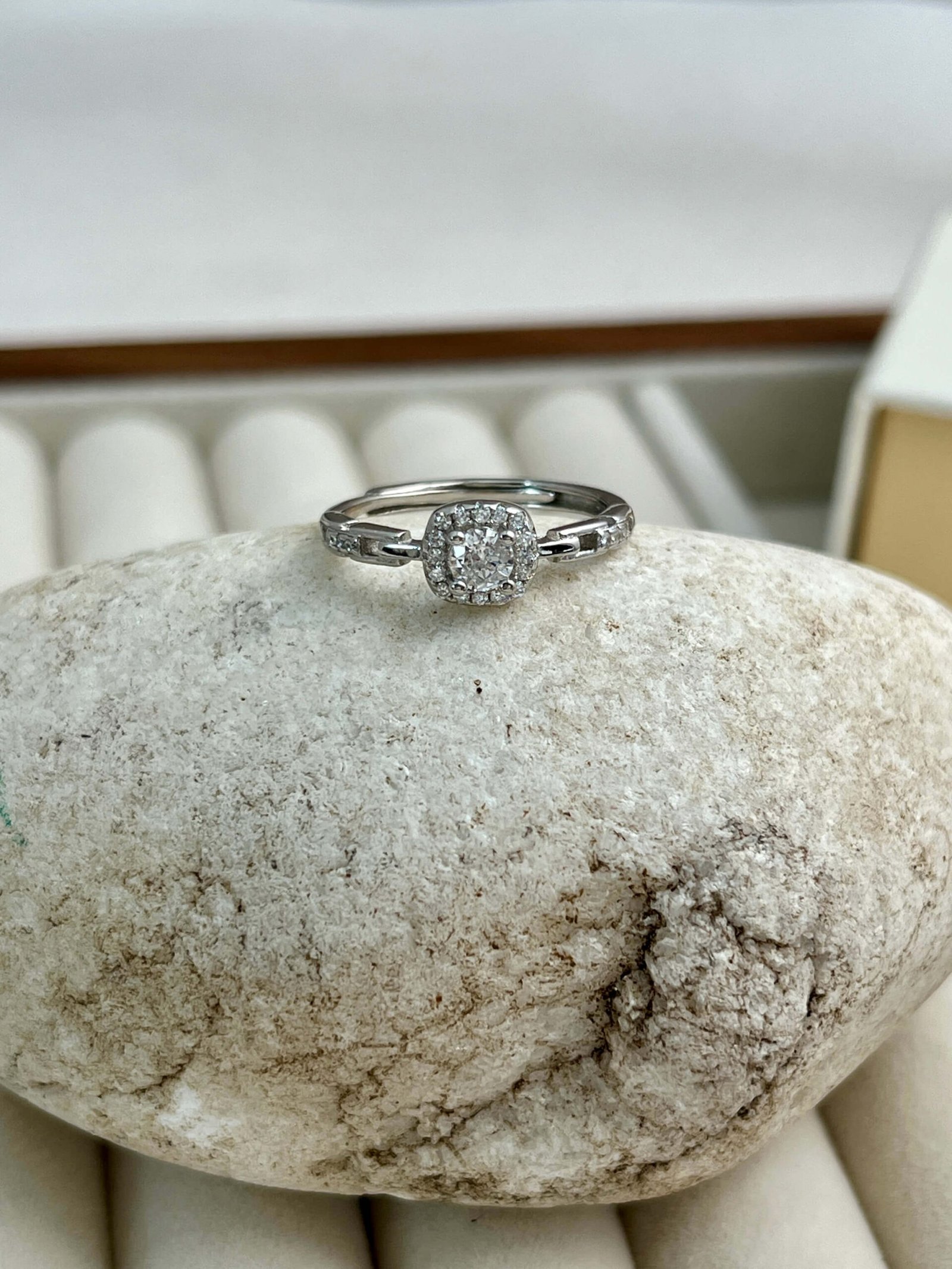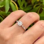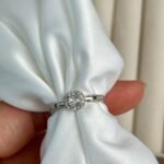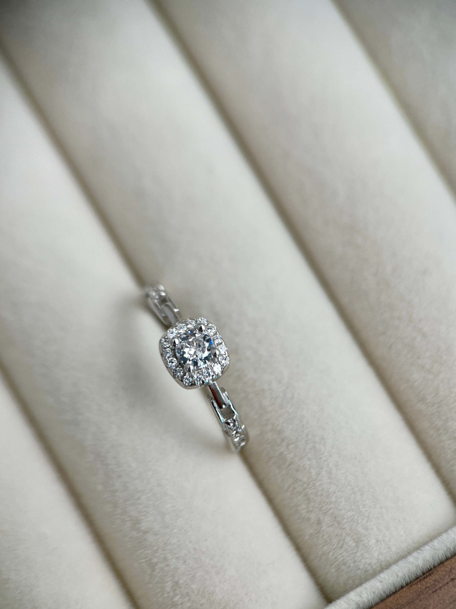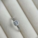 Este diseño nace de la armonía entre la arquitectura moderna y el brillo clásico de la alta joyería, La pieza central presenta una circonita de corte brillante rodeada por un halo cuadrado de pequeñas piedras, creando un efecto de «espejo» que maximiza el reflejo de la luz. Es una interpretación contemporánea del anillo de compromiso clásico.
