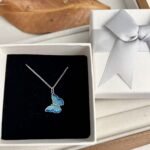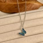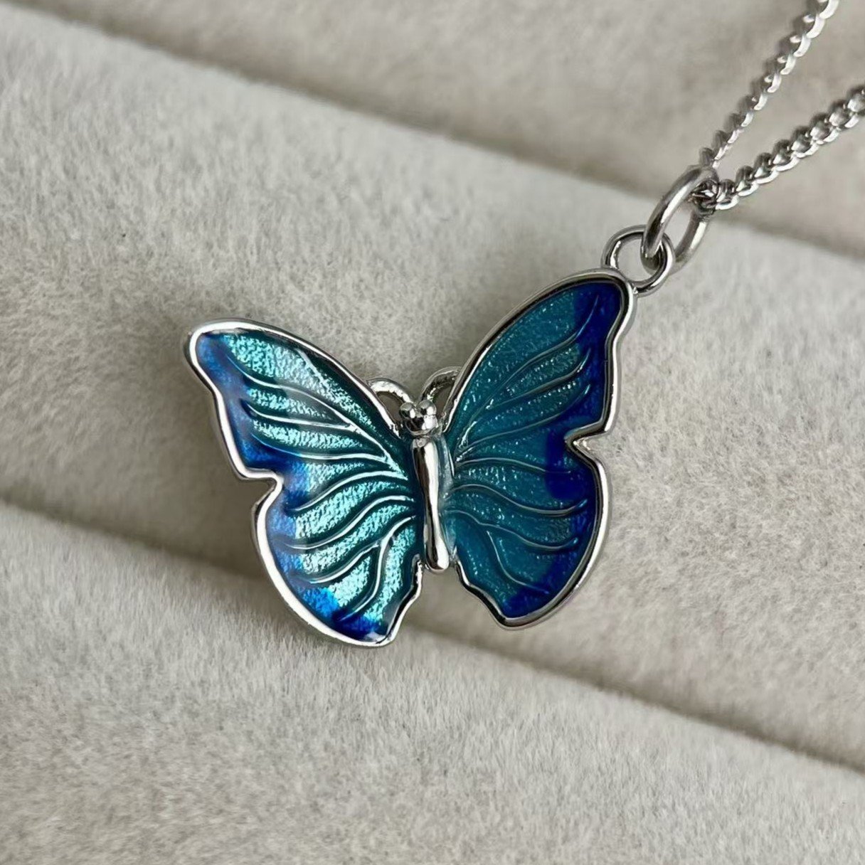 Inspirado en la transformación y la libertad de la naturaleza, este collar captura la esencia de una mariposa en pleno vuelo. El detalle protagonista es su exquisito trabajo de esmalte en tonos azul profundo y turquesa, aplicado meticulosamente para crear un efecto de gradiente que imita el brillo de las alas reales bajo la luz.