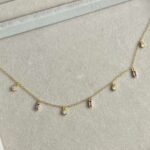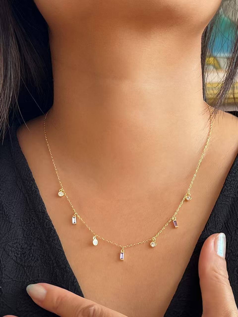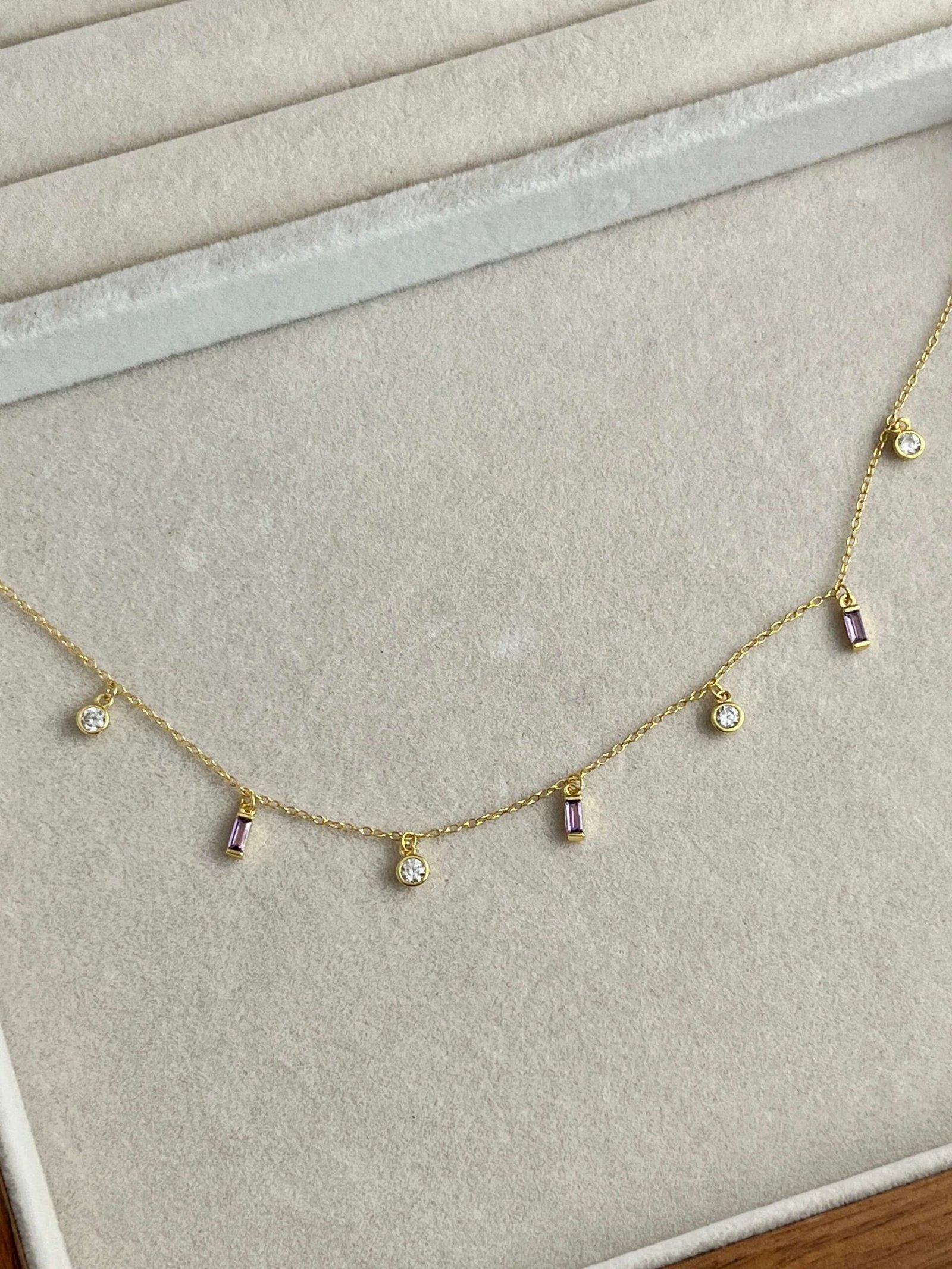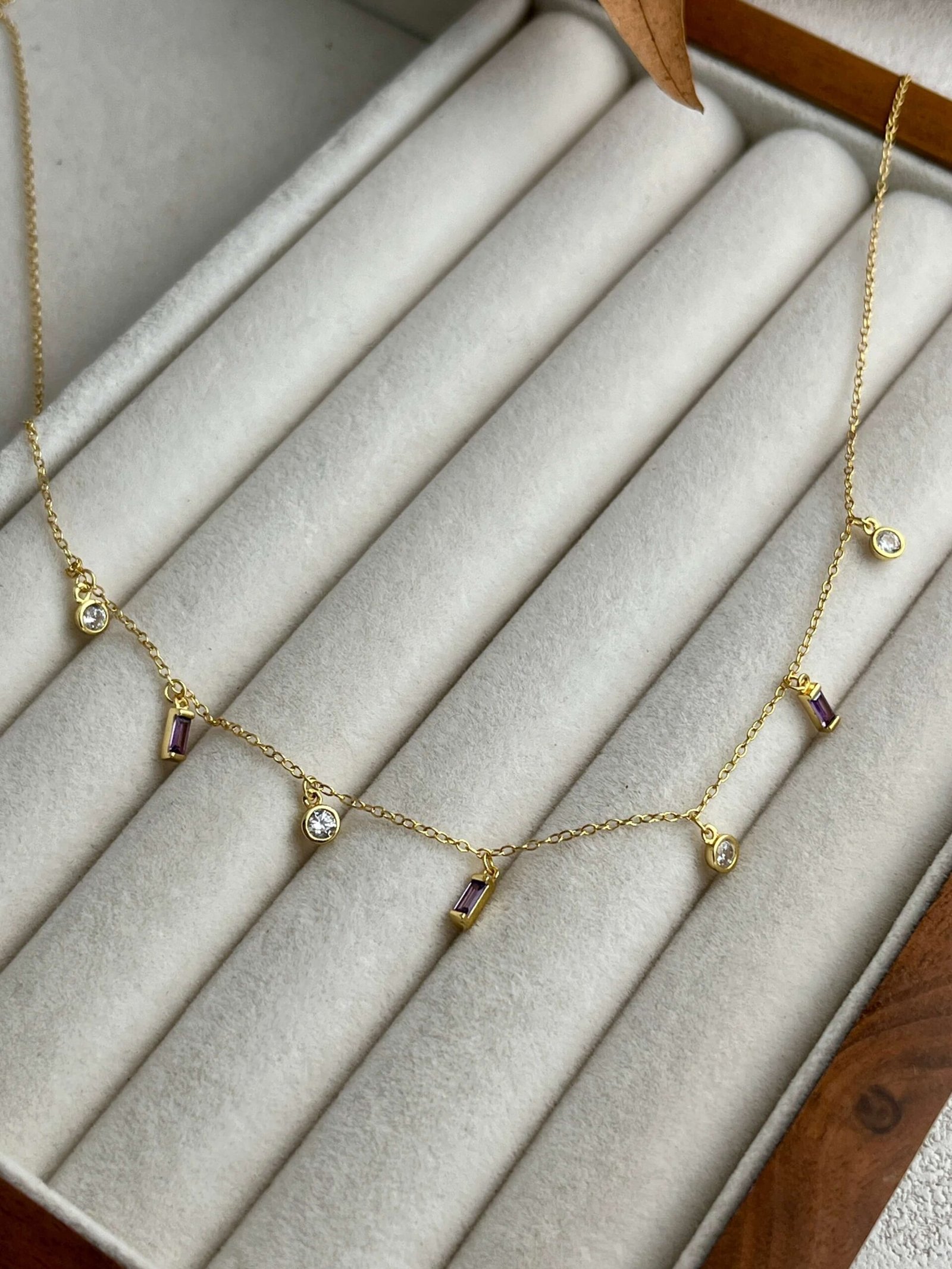 El collar está elaborado en Plata de Ley 925 con un acabado refinado. Presenta una secuencia rítmica de cristales en dos cortes distintos: circonitas circulares que aportan un brillo clásico y cristales rectangulares en tono amatista que añaden una profundidad mística. Esta combinación de formas geométricas crea un efecto de «flecos de luz» que se mueve con gracia sobre la piel, iluminando el escote con un aire de sofisticación francesa. Es una joya pensada para la mujer que busca un detalle distintivo, capaz de transformar un look básico en uno lleno de elegancia y magnetismo.