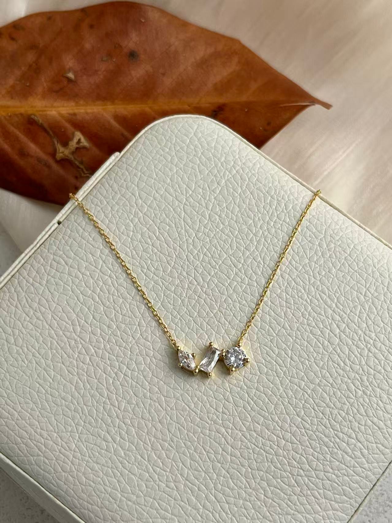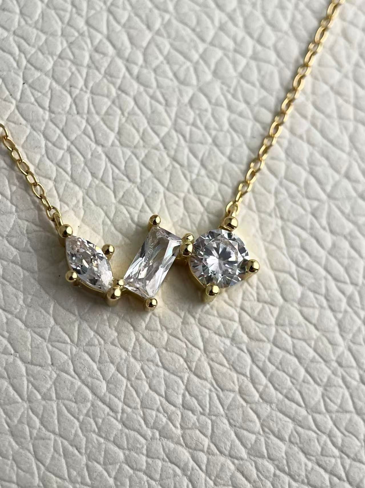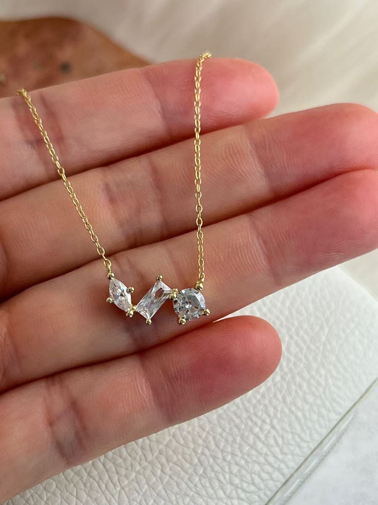 Este diseño nace de la belleza de la asimetría equilibrada. Inspirado en la luz que se fragmenta a través de un prisma, este collar presenta un trío de cristales con cortes marquise, baguette y redondo, creando un juego de destellos único sobre la piel. Elaborada en Plata de Ley 925, es una pieza pensada para la mujer que busca una joya contemporánea y sofisticada que destaque por su originalidad geométrica, siendo el amuleto perfecto para iluminar el día a día con una elegancia moderna.