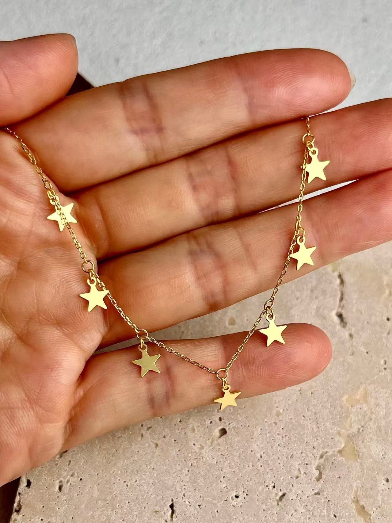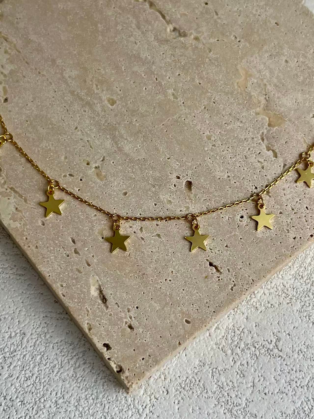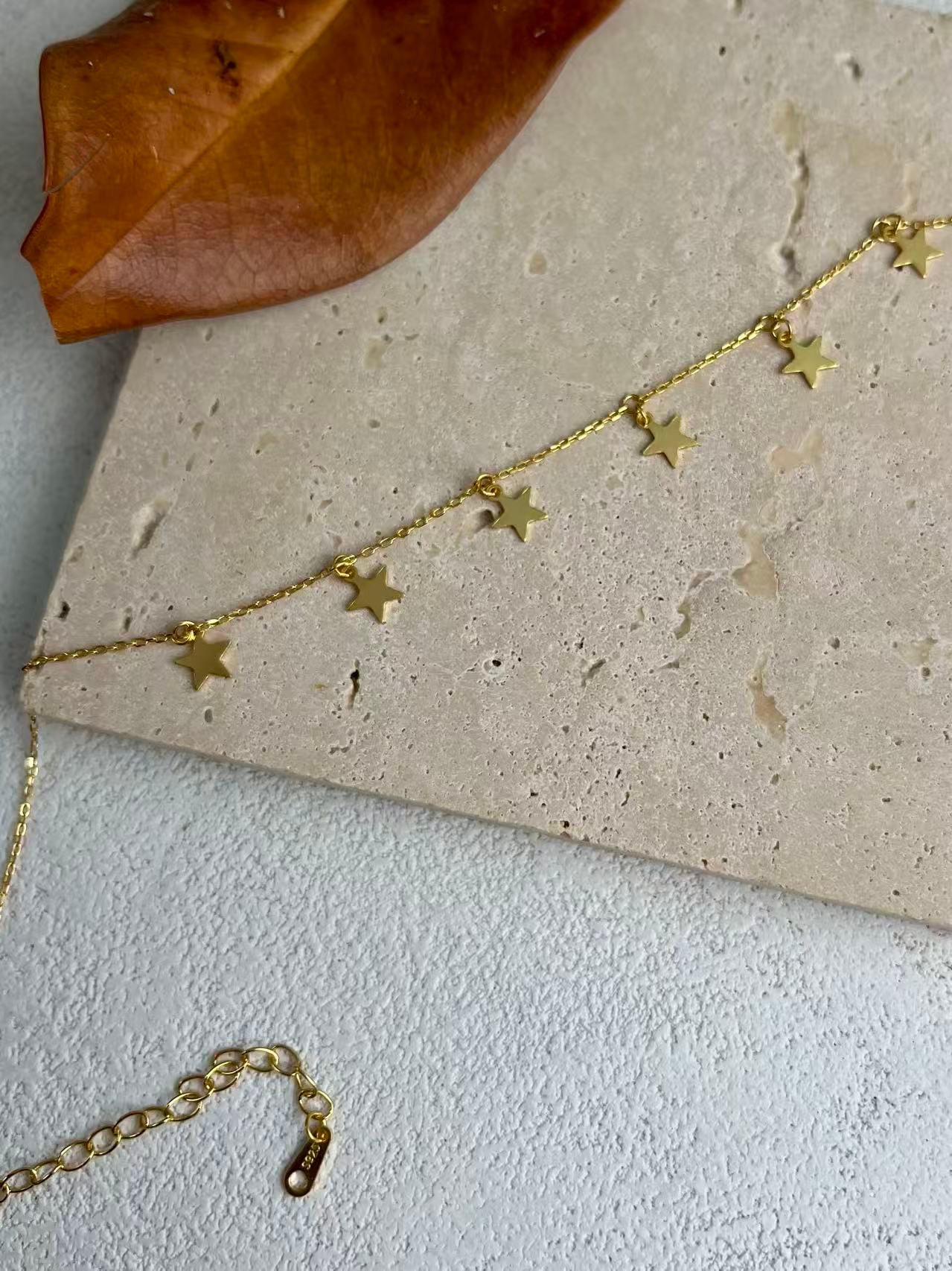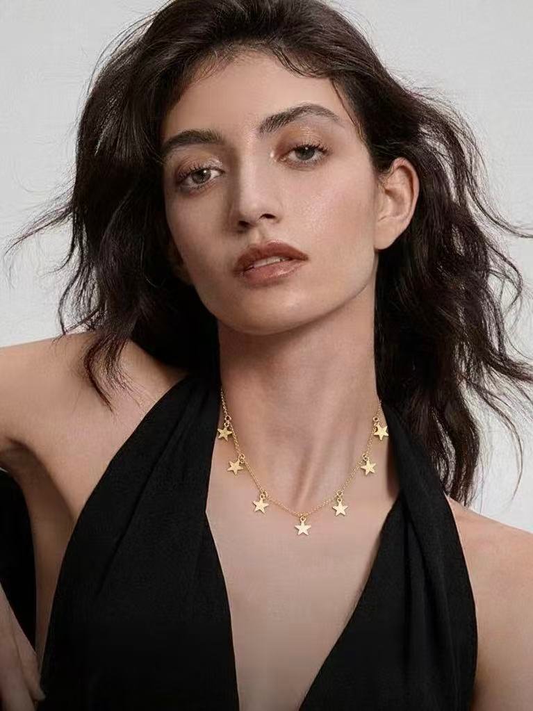 Inspirada en el brillo eterno de una constelación, esta gargantilla de plata combina la elegancia de los dijes de estrellas con un diseño minimalista y versátil. Cada estrella colgante captura la luz de forma dinámica, creando una joya celestial perfecta para un look sofisticado de diario o como un amuleto de protección y guía personal.
