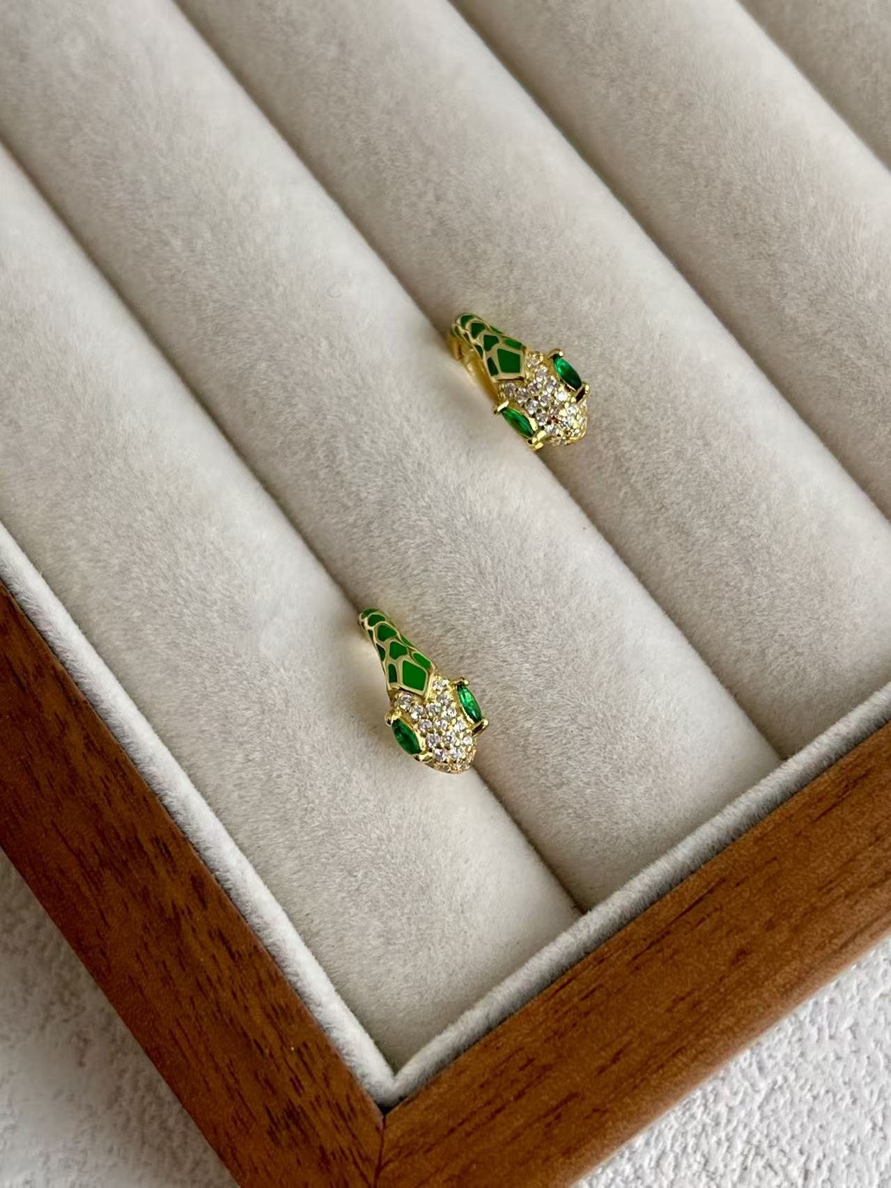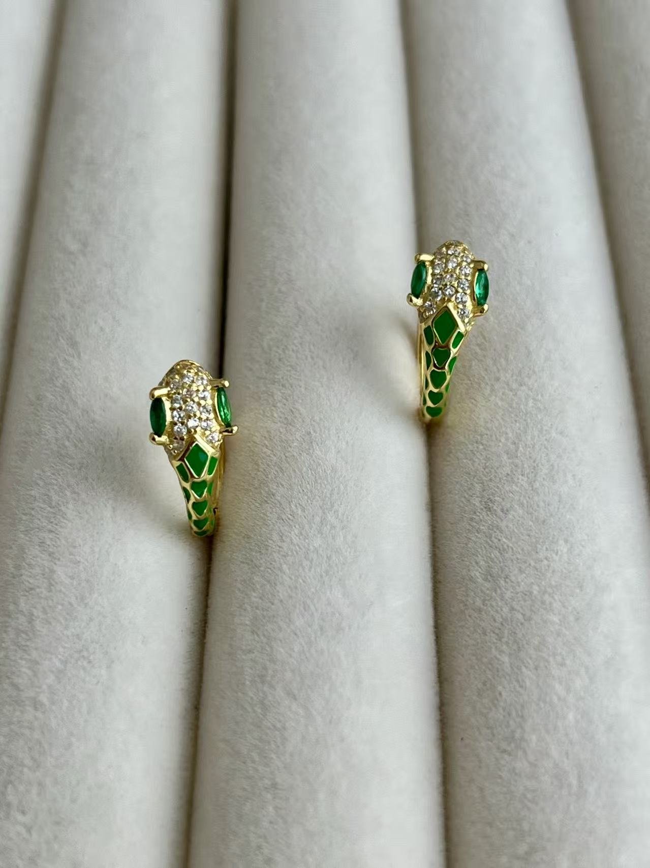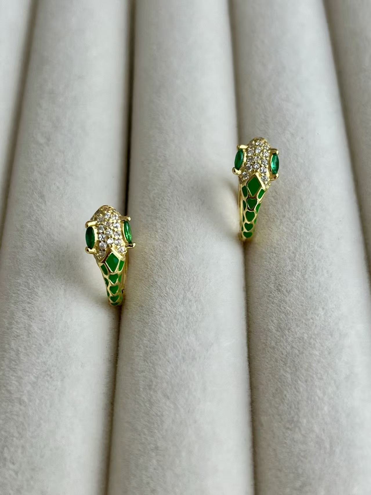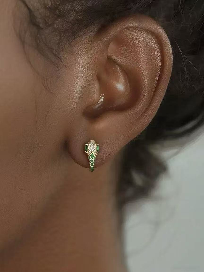 Esta pieza está inspirada en la serpiente, un símbolo milenario de transformación, sabiduría y elegancia eterna. Elaborados en plata de ley 925 con un exquisito baño de oro, estos pendientes presentan una cabeza de serpiente detallada con esmalte blanco y pavé de circonitas que capturan la luz de manera deslumbrante. El toque distintivo lo aportan sus ojos en verde esmeralda, que simbolizan la intuición y la protección. Es una joya diseñada para la mujer audaz que busca un accesorio con carácter, combinando el misticismo del mundo animal con la sofisticación de la alta joyería contemporánea.