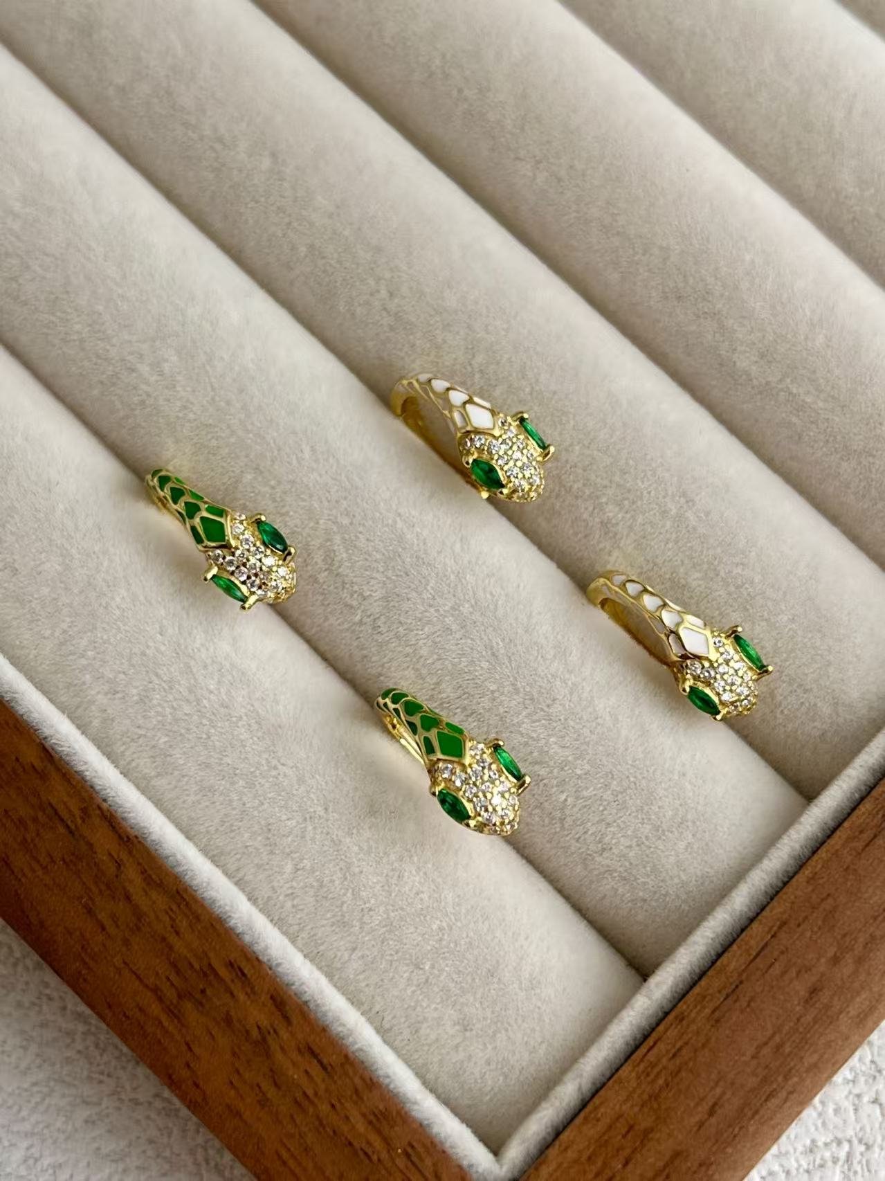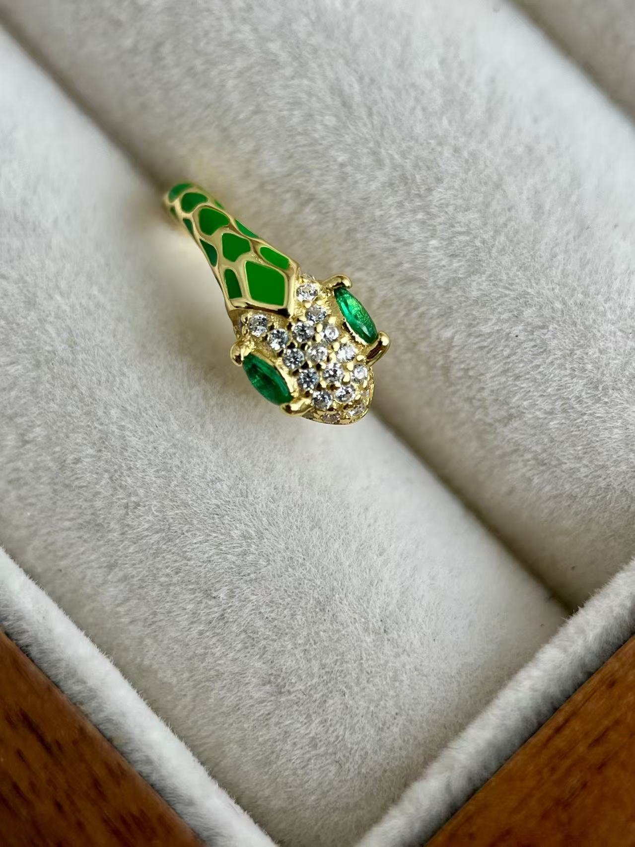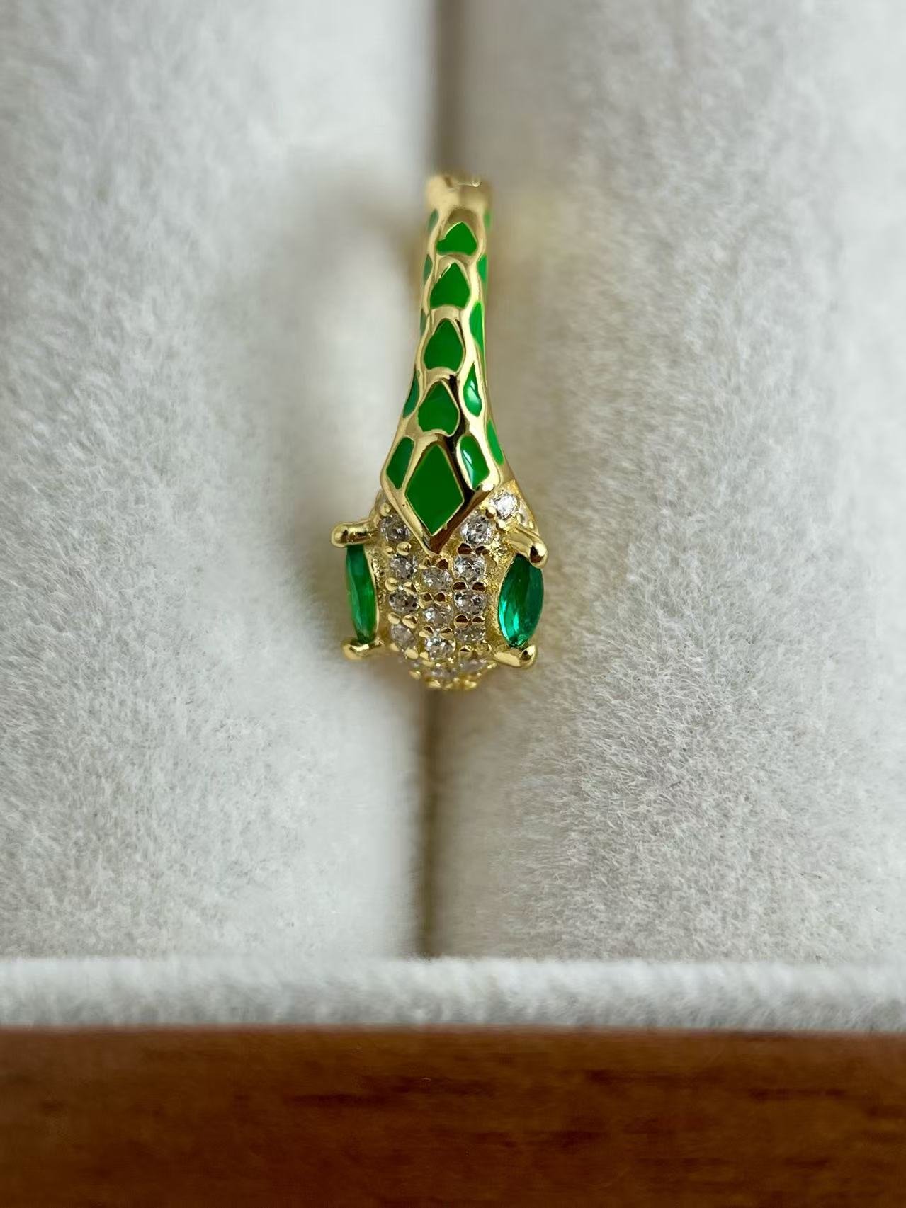 Esta pieza está inspirada en la serpiente, un símbolo milenario de transformación, sabiduría y elegancia eterna. Elaborados en plata de ley 925 con un exquisito baño de oro, estos pendientes presentan una cabeza de serpiente detallada con esmalte blanco y pavé de circonitas que capturan la luz de manera deslumbrante. El toque distintivo lo aportan sus ojos en verde esmeralda, que simbolizan la intuición y la protección. Es una joya diseñada para la mujer audaz que busca un accesorio con carácter, combinando el misticismo del mundo animal con la sofisticación de la alta joyería contemporánea.